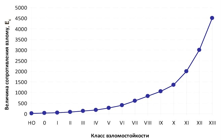 Характерно, что зависимость между значением величины Ес и классом взломостойкости является совсем не линейной величиной. На графике хорошо виден довольно существенной рост требований к взломостойкости изделия для получения сертификатов на старшие классы (взято минимально необходимое значение Ес для полного доступа).