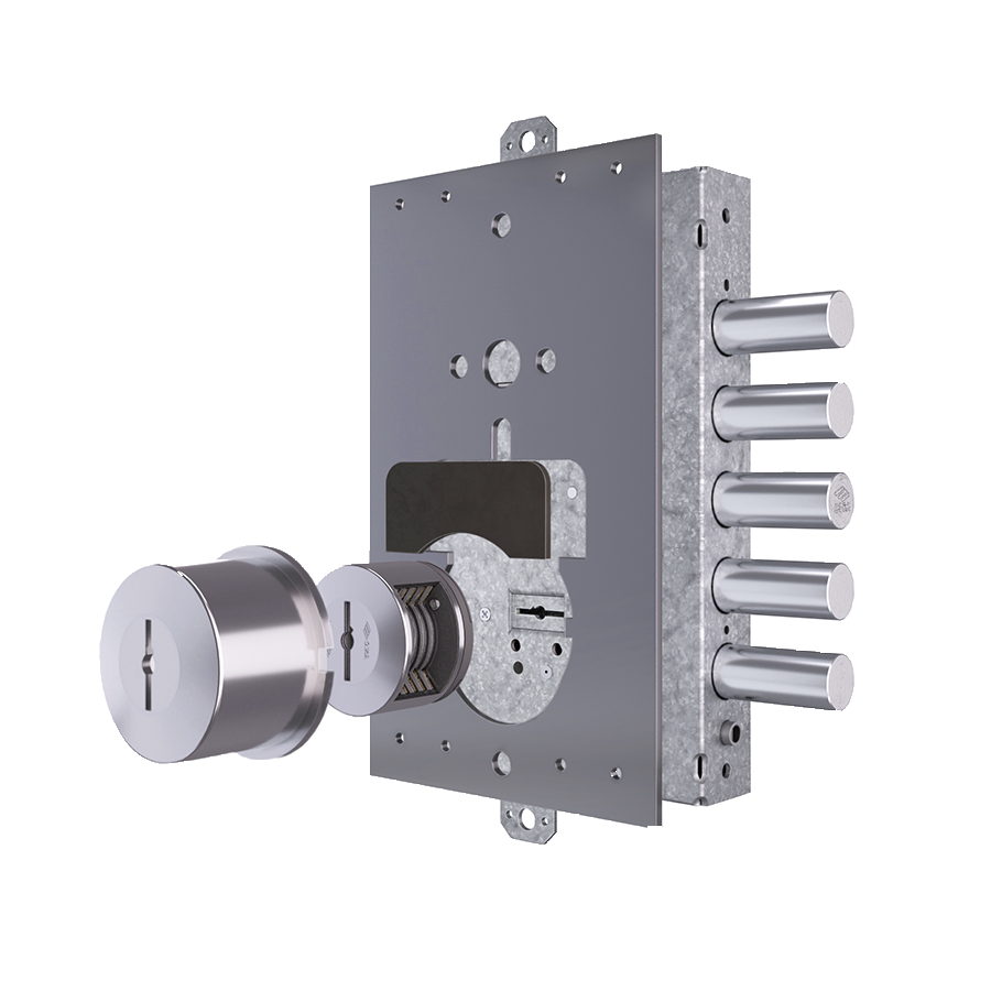 1. На базе перекодировочного сувальдного замка без защёлки CISA 57675. В комплект к перекодировочным замкам устанавливается накладка CISA 02716, которая поставляется с двумя комплектами ключей, по пять штук в каждом, отличающихся нарезкой сувальдной части, при этом нарезка под секрет шлюза у них одинаковая. Один из комплектов используется для монтажа и проверки замка при производстве двери, в дальнейшем он может применяться клиентом как запасной. Второй комплект остается запечатанным и может быть вскрыт клиентом в любой момент, когда возникнет необходимость перекодировки замка.