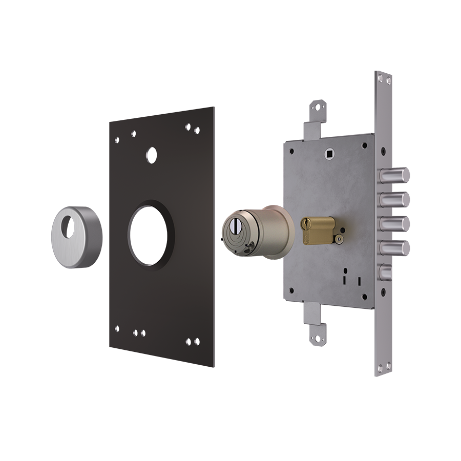 1. На базе замка системы "антипаника" Mottura GORILLA, который позволяет лёгким поднятием ручки изнутри запирать дверь на все засовы, при этом нажатие ручки вниз открывает автоматически все засовы и убирает защёлку. Снаружи при этом замок работает в обычном режиме: поворот ключа цилиндрового механизма выдвигает/задвигает засовы, ручка нажимается только вниз и управляет только защёлкой.
