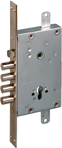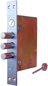 - замка-блокиратора — запирание стальной двери производится с помощью ригеля и одновременно блокируется тяга другого замка.