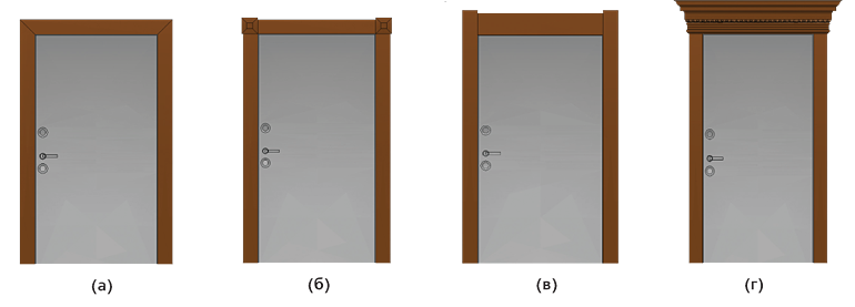 - Использование массивных многоуровневых верхних капителей, которые устанавливаются сверху, на вертикальные части наличников (г).