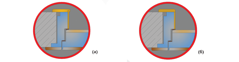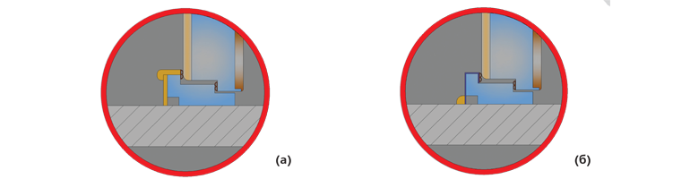 По умолчанию стыковка между наличниками и облицовкой откосов производится по технологии, позволяющей скрыть непосредственное место стыка (а) . Для этого в наличнике образовывается паз, в который при монтаже входит добор. В результате наличник немного выступает относительно откосов вглубь проёма.